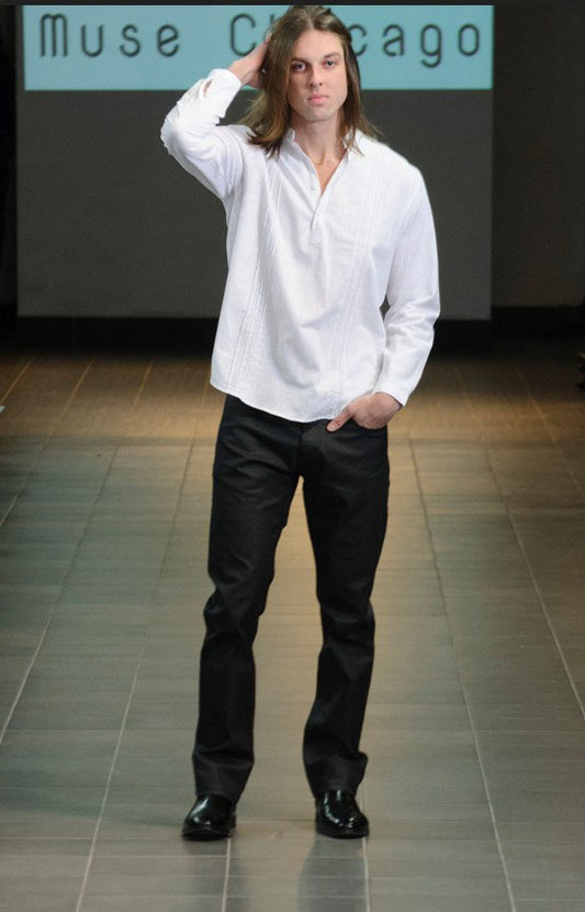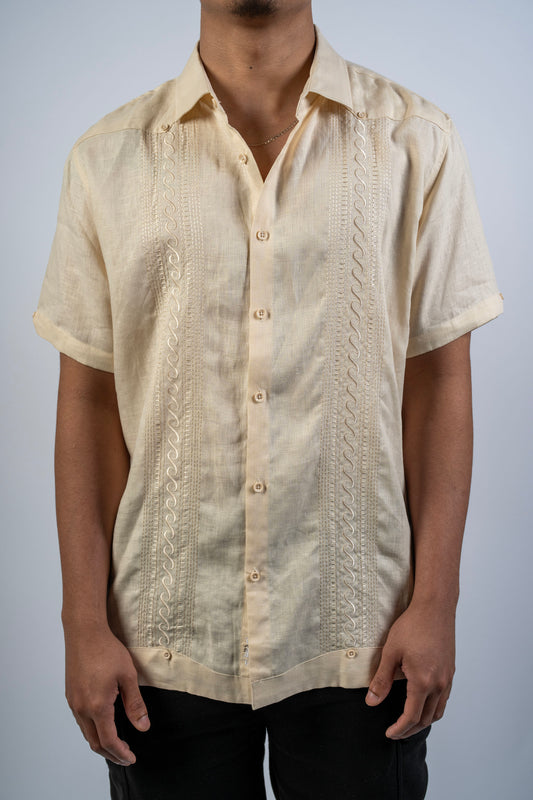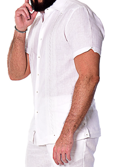 MEN'S LINEN GUAYABERA SHORT SLEEVE EMBROIDERED PANEL SHIRT